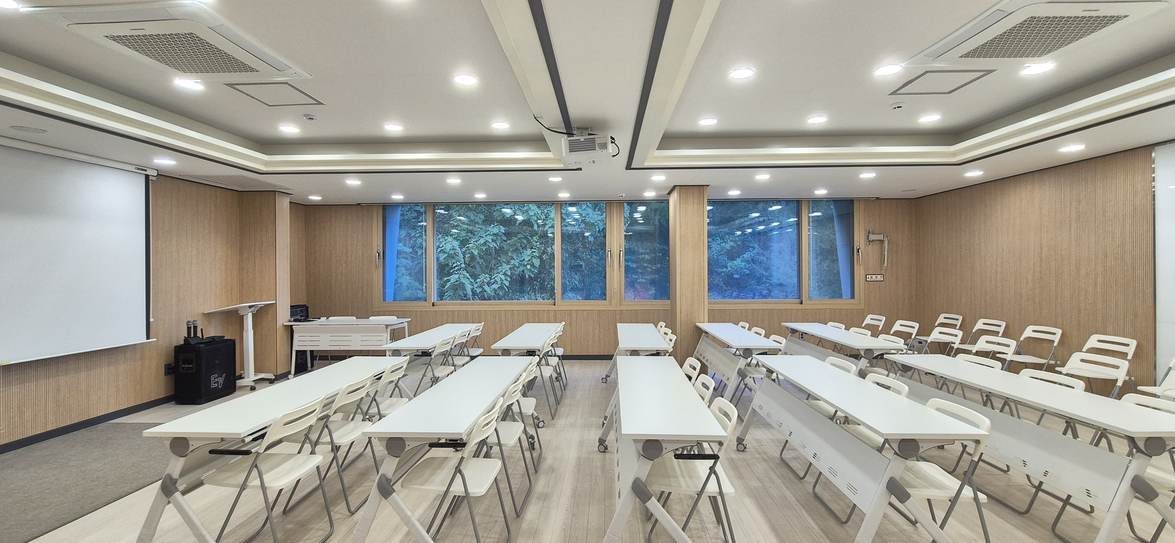 숲속 풍경이 액자처럼 펼쳐지는 60명 세미나실