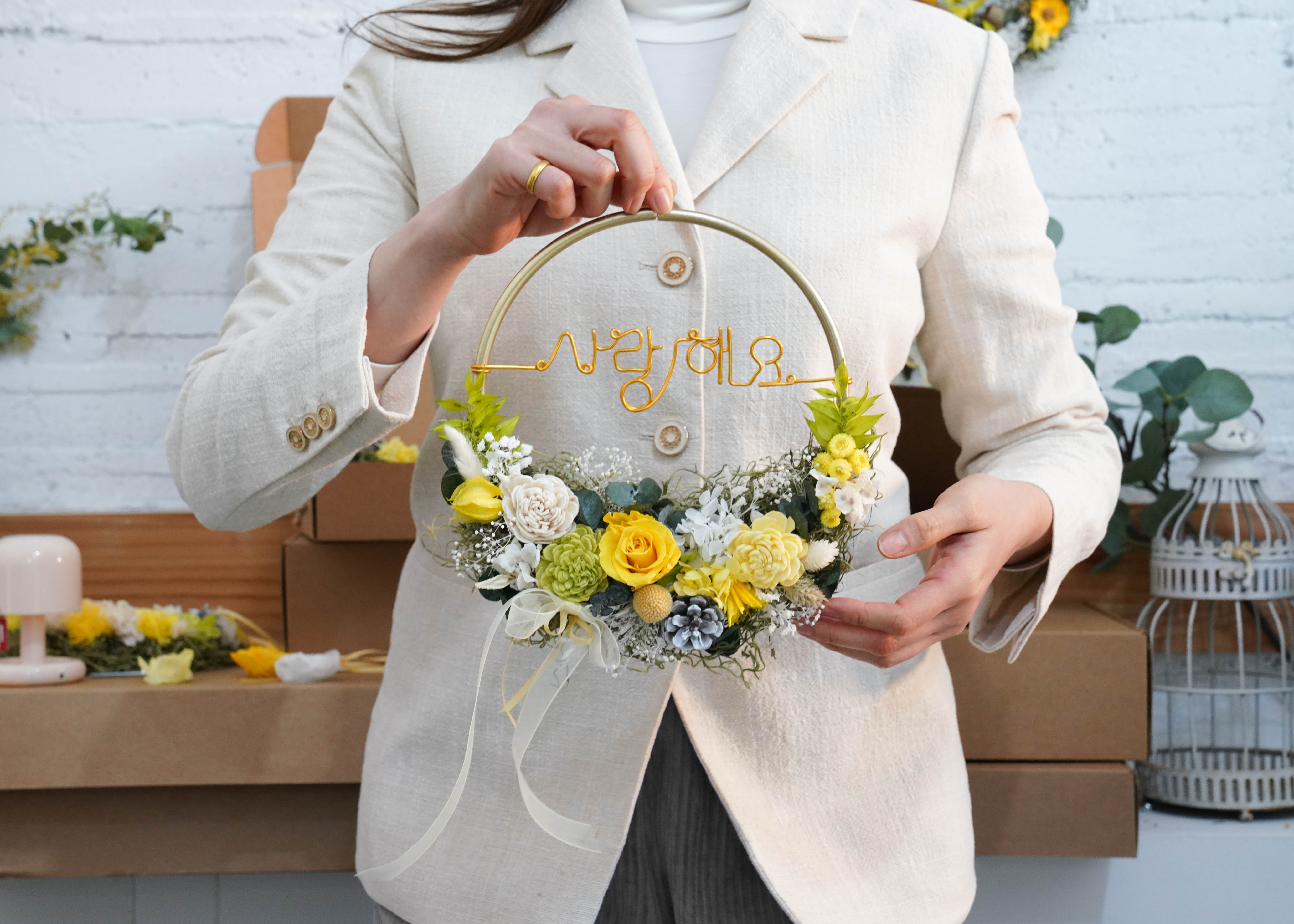 플라워 리스 만들기프리저브드 플라워 설명 꽃 배치 구상하기 글루건 & 가위로 꽃 디자인 제작 강사의 실시간 피드백