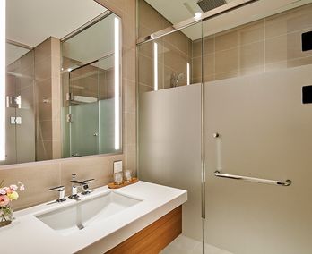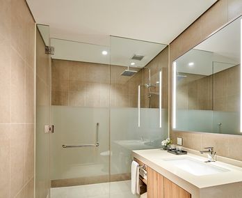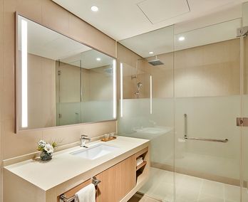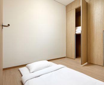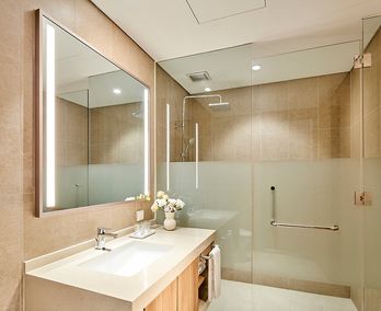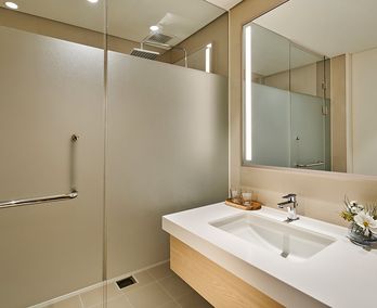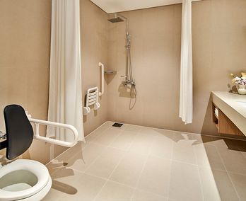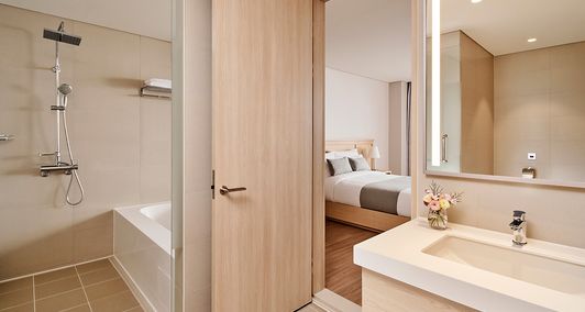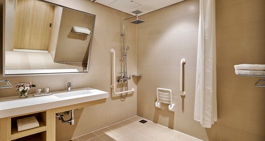 장애, 나이 등으로 인해 불편하지 않도록 설계된 베리어프리(Barrier Free) 호텔 타입 객실로 단층 제거, 안전바 설치, 낮은 세면대와 거울, 실내 미닫이 문이 특징입니다.