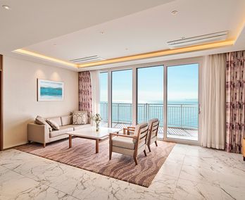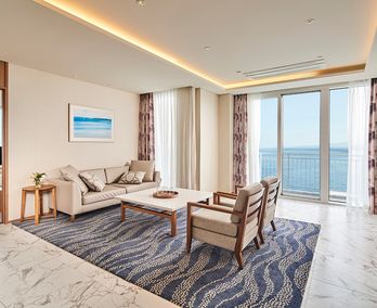 오션뷰가 한눈에 펼쳐지는 최상의 위치와 럭셔리한 인테리어로 VIP에게 감동을 선사할 롯데리조트속초의 최고의 객실입니다.