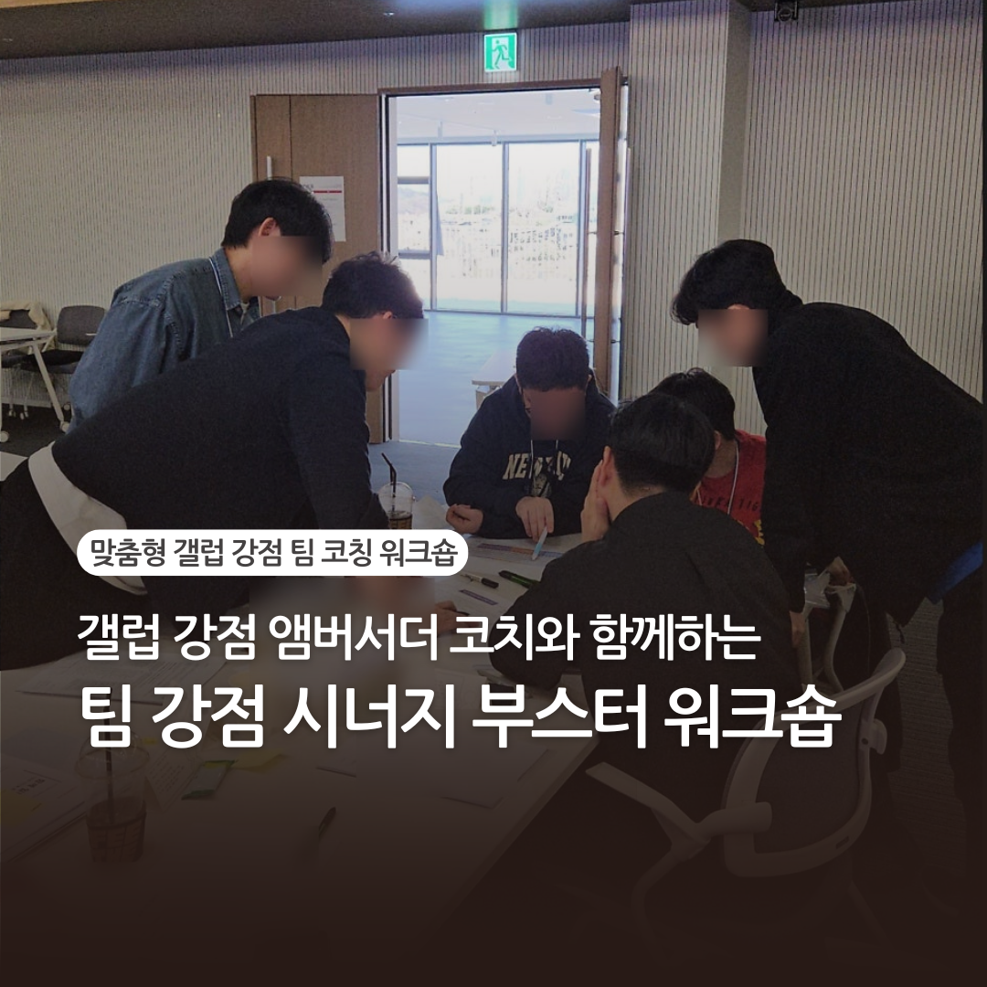 성과를 내는 팀은 ‘서로의 다름을 이해하고 강점으로 연결하는 팀’ 입니다. 지금 당신의 팀은 서로를 강점으로 보고 있나요, 아니면 여전히 약점을 보완하려 애쓰고 있나요? 30년간 전 세계 글로벌 기업의 다양한 산업, 직무, 직급 구성원 200만명을 분석한 '갤럽 강점 진단(CliftonStrengths)'을 기반으로 팀이 가진 고유한 강점을 발견하고, 그것을 협업·몰입·성과로 이어지게 하는 실전 코칭 프로그램입니다. 대한민국 1,000여 명의 강점 코치 중 단 12명만 선정된 갤럽 강점 앰버서더 코치가 직접 팀 코칭을 진행하며, 진단 해석을 넘어 ‘팀의 강점이 실제로 작동하는 방식’을 디브리핑하고, 함께 찾아갑니다. 💡이 워크숍을 통해 팀은 다음을 경험합니다. ✅️서로의 강점을 “언어”로 이해하며 심리적 안전감이 형성됩니다. ✅️강점 기반 피드백과 소통을 통해 몰입도와 생산성이 높아집니다. ✅️개인의 강점이 팀의 성과로 연결되는 실행 전략을 구체화합니다. 강점은 단순한 진단이 아니라, 팀의 성장과 성과를 견인하는 전략입니다. 다름을 이해하고 강점으로 서로가 연결되는 순간을 경험해 보세요!